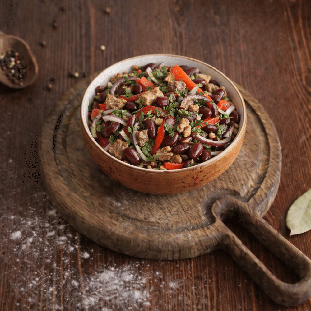 Это сытное и ароматное блюдо. Отварная говядина, красная фасоль, болгарский перец, маринованный лук, зелень, грецкий орех, гранат, уксус, специи и чеснок создают неповторимое сочетание вкусов. Попробуйте Салат Тбилиси и насладитесь его ярким вкусом!