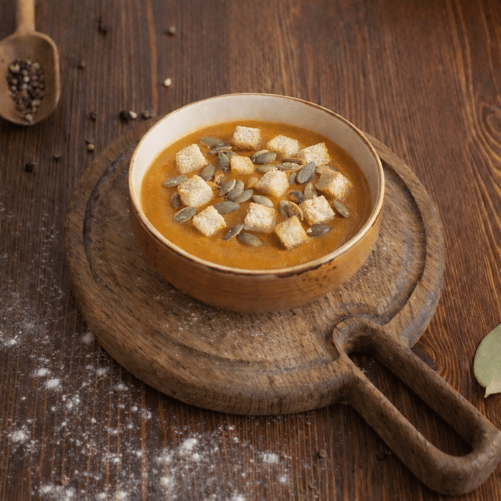 Этот густой и нежный суп обладает утончённым вкусом. В его основе – тыква, которая придаёт ему характерный аромат и лёгкую сладость. Дополняют вкус овощи – лук, картофель и морковь.