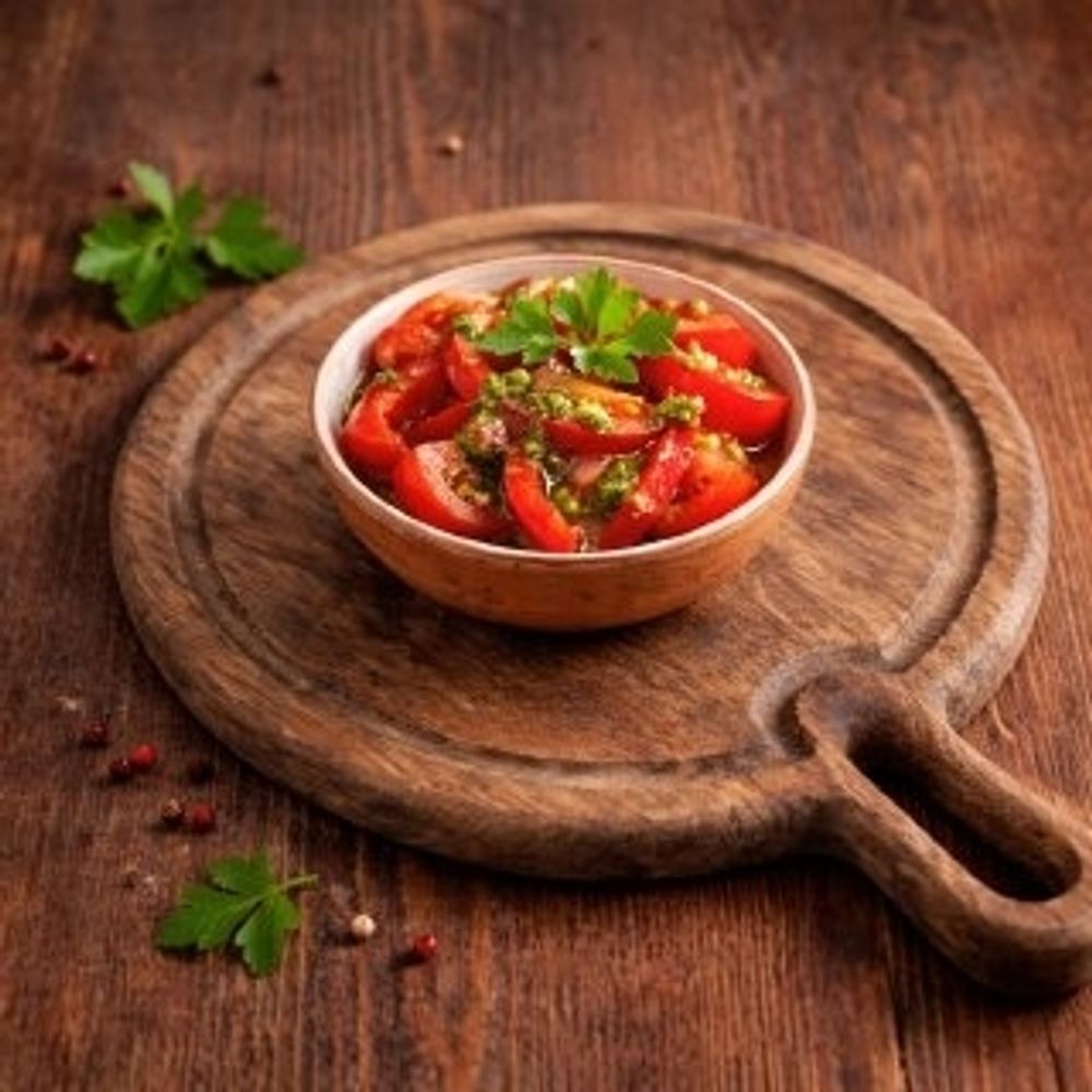 Сочное сочетание спелых помидоров, сладкого болгарского перца и свежей зелени, дополненное неповторимым вкусом пикантной заправки.